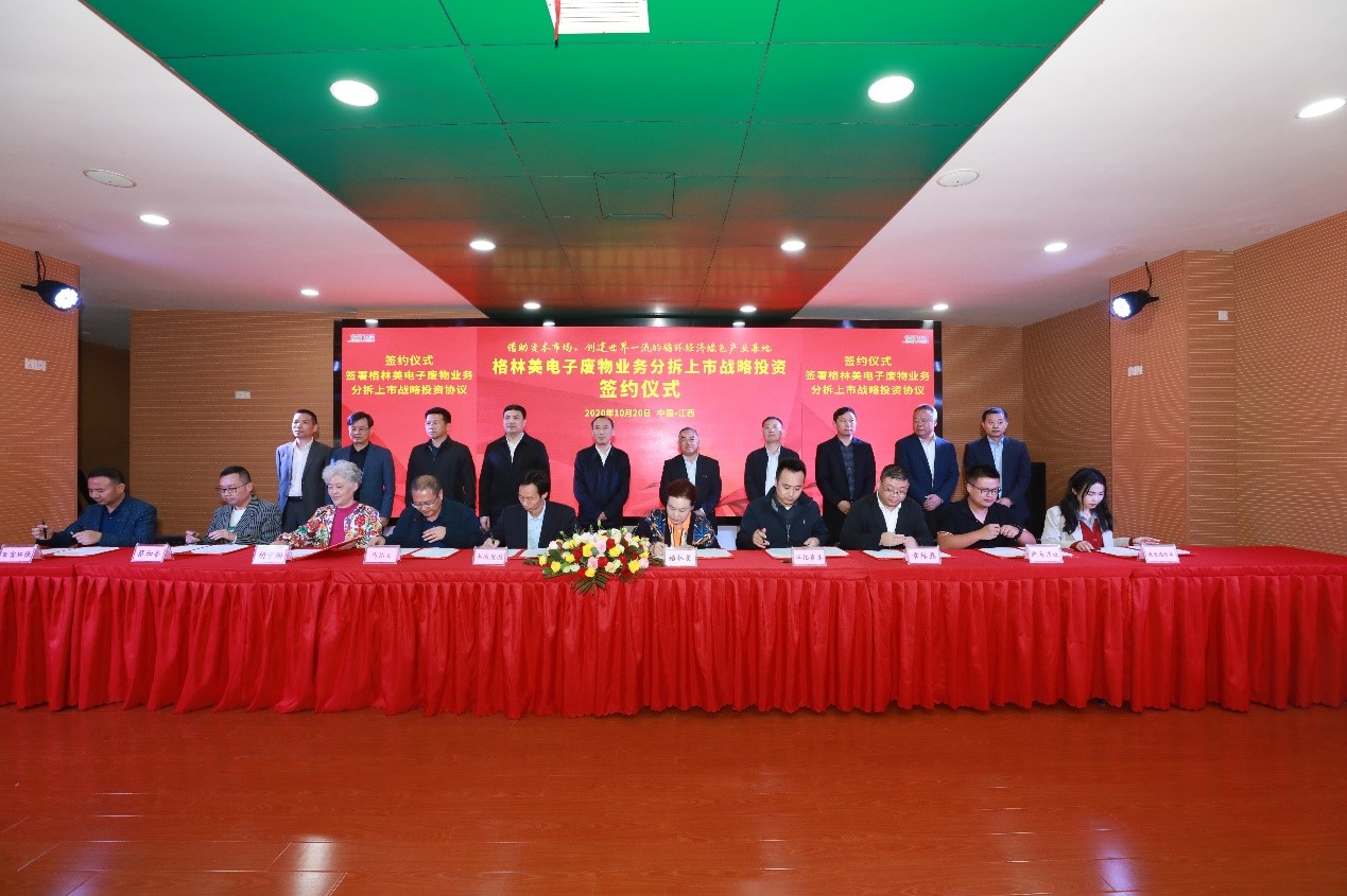 On the afternoon of October 20, 2020, the signing ceremony of strategic investment for the spin-off listing GEM electronic waste business was held in GEM Jiangxi Industrial Park. The signing ceremony was attended by more than 200 participants, including Yu Xiuming, Party Secretary of Yichun City, Cai Qingping, Executive Member of the CPC Yichuan Municipal Committee and Executive Vice Mayor of Yichun City, Wu Yiqun, Chief of Staff of CPC Yichun Municipal Committee, Li Xiaochu, Party Secretary of Fengcheng City, Xu Jieqiang, Deputy Paty Secretary and Mayor of Fengcheng City, more than ten strategic investors such as Fengcheng Development and Investment Holding Group Co., Ltd., and over 20 strategic clients such as Kingfa Technology, Nanjing Julong, Silver Age, Orinko and Shanghai RE-MALL, etc.