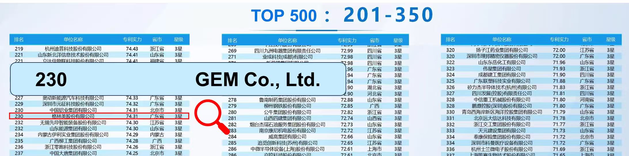 This significant improvement in GEM’s patent strength ranking reflects the success of its long-standing innovation formula: “Super Talent + Super Equipment + Super Innovation = Super Technology”.