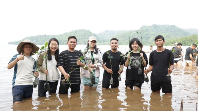 ▲ Volunteers planting mangrove seedlings in the wetlands